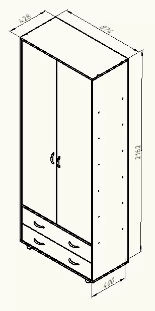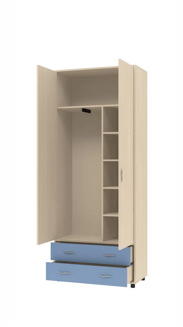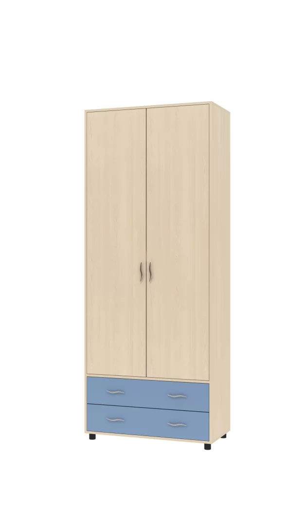 Шкаф двухстворчатый "Дельта-4" - функциональный предмет мебели для детской комнаты. Модуль включает антресольную полку, большое вертикальное отделение с выдвижной штангой, отделение с 4 полками. Внизу расположены два вместительных выдвижных ящика, которые можно эффективно использовать в качестве комода. Шкаф является универсальным, расположение полок и штанги можно менять как на одну, так и на другую сторону.