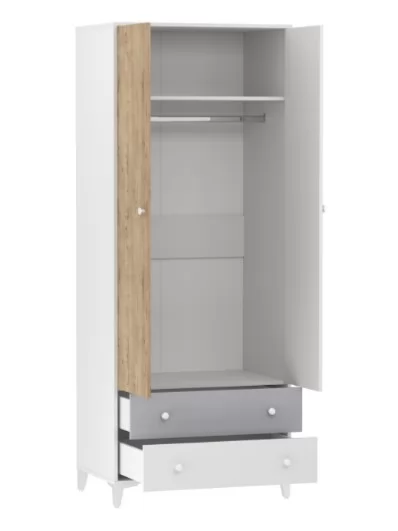 Шкаф «Морти» на высоких изящных ножках предназначен для тех, кто любит простоту и минимализм. Шкаф обладает модным сочетанием материалов и, благодаря характерным декоративным особенностям, понравится всем поклонникам скандинавского стиля. Отделение с полкой и штангой предназначено для хранения одежды на вешалках, головных уборов, коробок с аксессуарами. Два выдвижных ящика предназначены для сложенной одежды, аксессуаров, личных вещей.