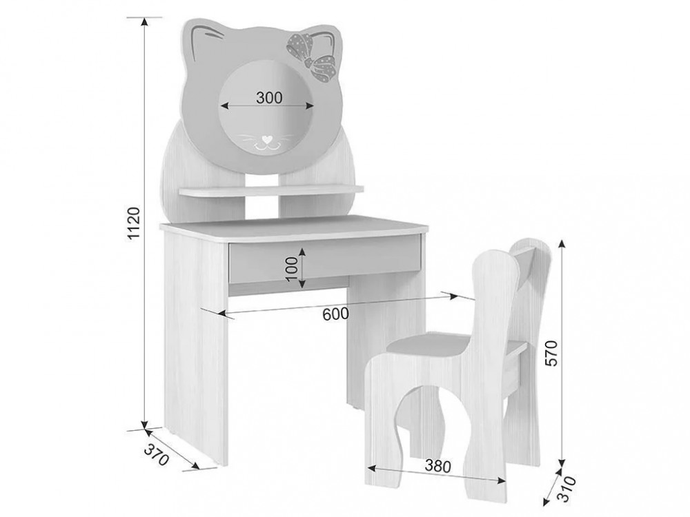 • Столик-трюмо с ящиком и полкой: 1120 х 600 х 366 мм.