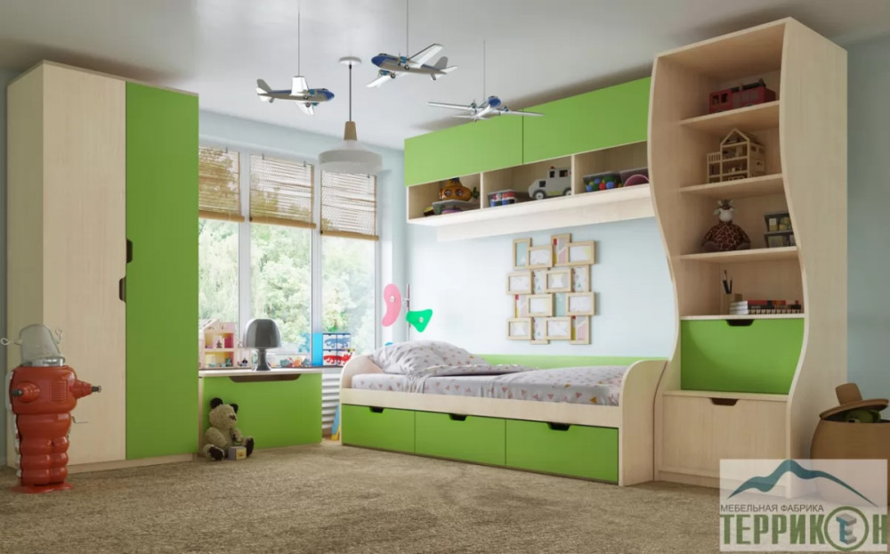Атмосферу счастья и беззаботности приносит в дом детская «Киви». Сочетание оттенков лайм и дуб молочный выглядит очень жизнерадостно. Малышам нравится отдыхать и играть в такой комнате. Они с удовольствием спят на двух- или одноярусной кровати, хранят вещи в шкафу и на стеллажах, убирают игрушки в специальную тумбу и учат уроки за удобным письменным столом.  Купить недорогов интернет-магазине "Диванчик-екб"