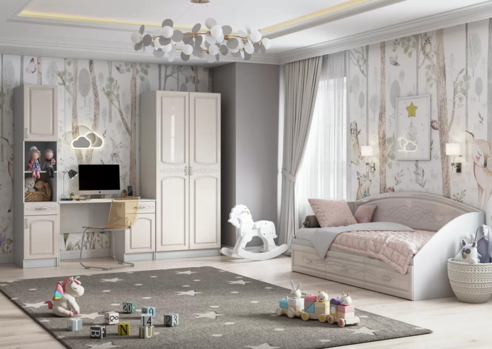 Модульная система Венеция в неоклассическом стиле. Благодаря изысканному рисунку и нежному цвету фасадов комната превращается в прелестный уголок девичьих грез.
