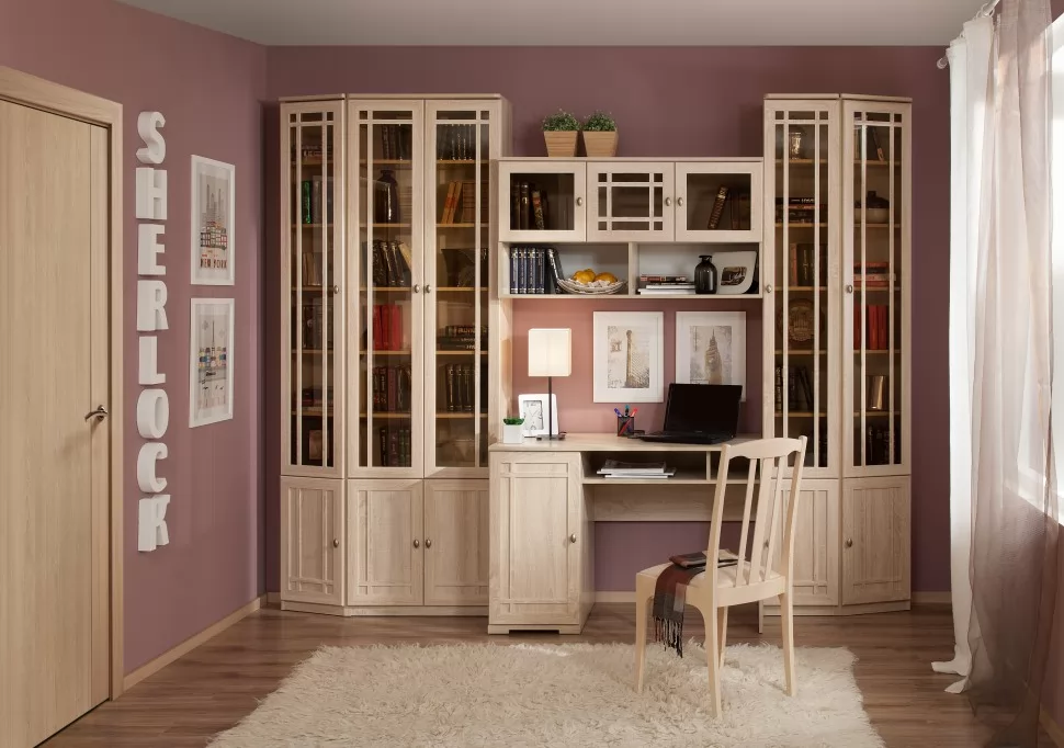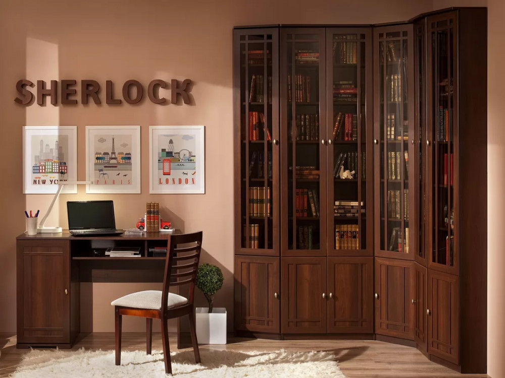 Библиотека выполнена в одном стиле в гостиной Шерлок, это даёт возможность обустроить всю квартиру единым образом или при необходимости расположить высокие книжные шкафы в гостиной и быть уверенным, что эта композиция будет отлично смотреться. В наше время многие люди по разным причинам предпочитают работать дома и обустройство удобного и элегантного рабочего пространства часто является важной задачей. Рабочий стол удобно встраиваемый в комплект шкафов позволит эргономично организовать рабочую зону,а изящество обстановки несомненно будет только способствовать хорошему рабочему настроению.