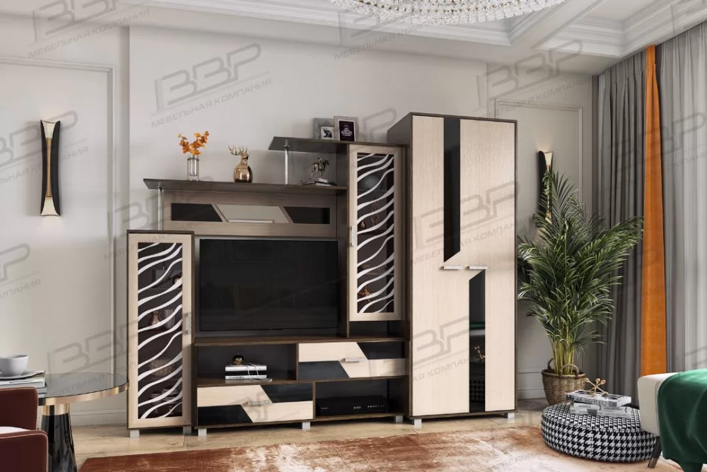Модульная система Нота-9 привлекает не только своей компактностью и функциональностью, но и её самобытным дизайном. В этой гостиной присутствует ритм и стиль за счёт игры горизонтальных линий во всём: на матовых стёклах с пескоструйным рисунком, на фасадах выдвижных ящиков, на дополнительном декоре в верхней части стенки – везде графика и геометрия линий.