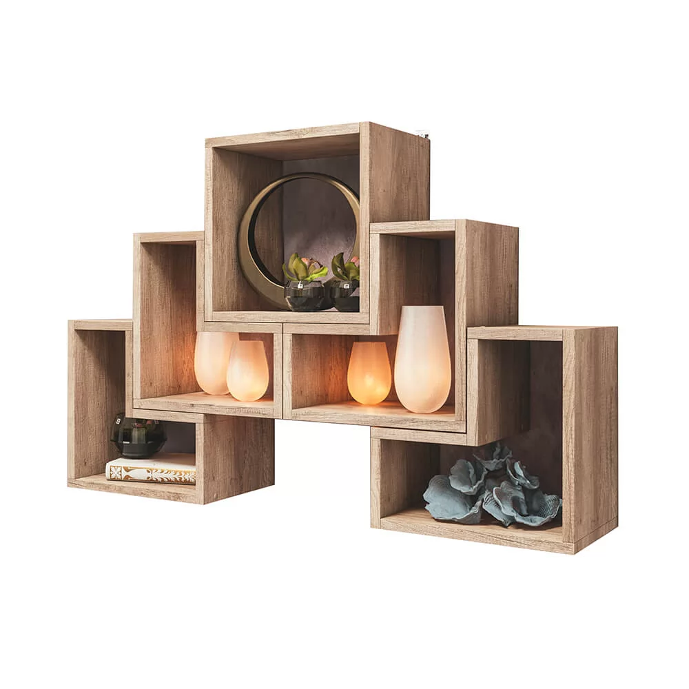Такой прием позволит вам организовать дополнительное место хранения для книг и предметов декора в любой комнате. Модель выполнена из ЛДСП под натуральное дерево, ее можно крепить на стену, а можно и разместить на полу.