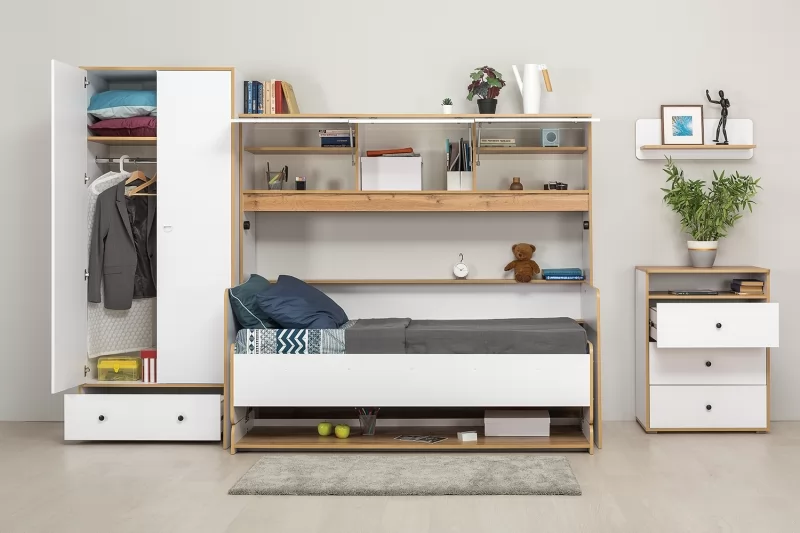Светлая и аккуратная молодёжная мебель. Основой модульной системы является кровать-трансформер. Её столешница имеет постоянный горизонт, то есть при трансформации не нужно убирать вещи. Система хранения с подъёмными фасадами значительно расширяет функционал. Также имеются письменный стол с надстройкой и полкой, шкафная группа и комод с тумбочкой. Вместе они позволяют создавать разноразмерные композиции, примеры которых - на фото слева.