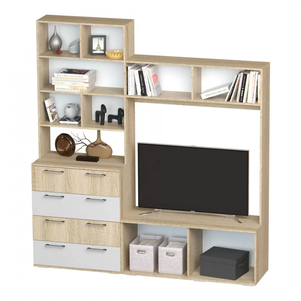 ЦС-03 - центральная секция. Функционал: 5 полок, 4 выкатных ящика, зона под ТВ, два отделения под ТВ зоной и два ящика на кронштейнах. Гостиная имеет нишу под ТВ размерами 1186х1044х460мм.