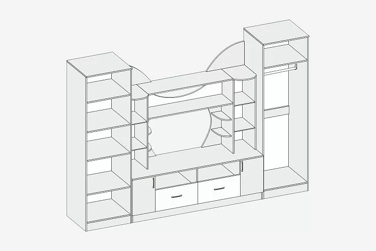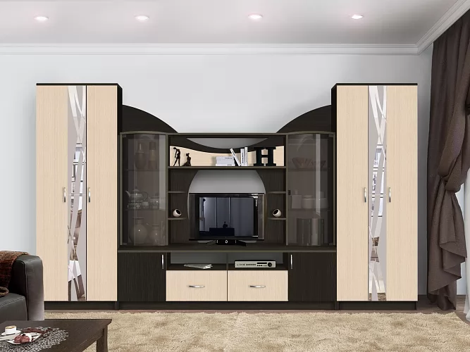 - центральную секцию (полки для книг, тумба под телевизор, шкафы-витрины с тонированным гнутым стеклом);