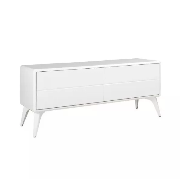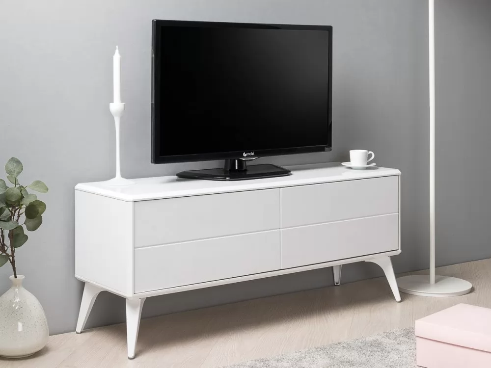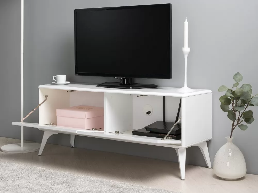 Металлические ножки служат надёжной опорой для изделия, а их белый глянцевый декор делает тумбу и ножки единым целым.