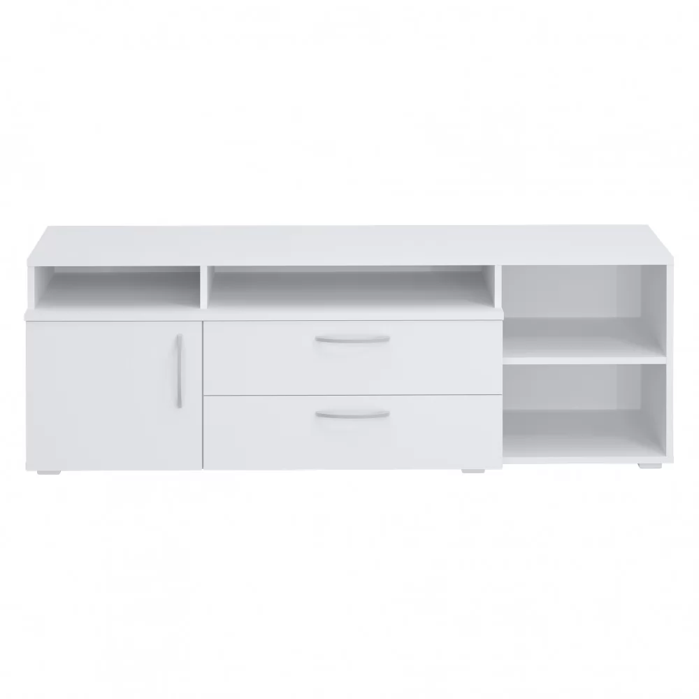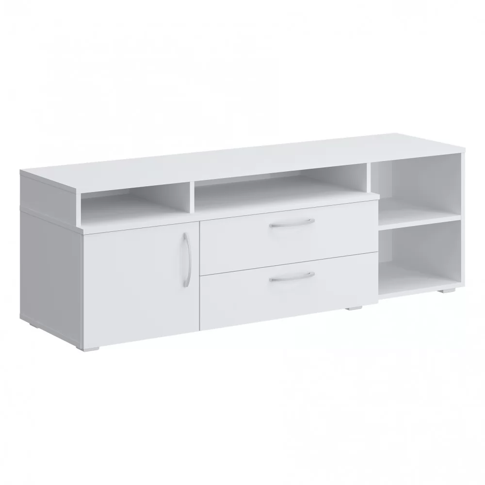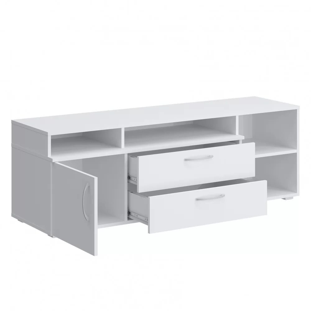 Современная низкая тумба под ТВ в универсальном белом свете станет приятным акцентом Вашей гостиной.