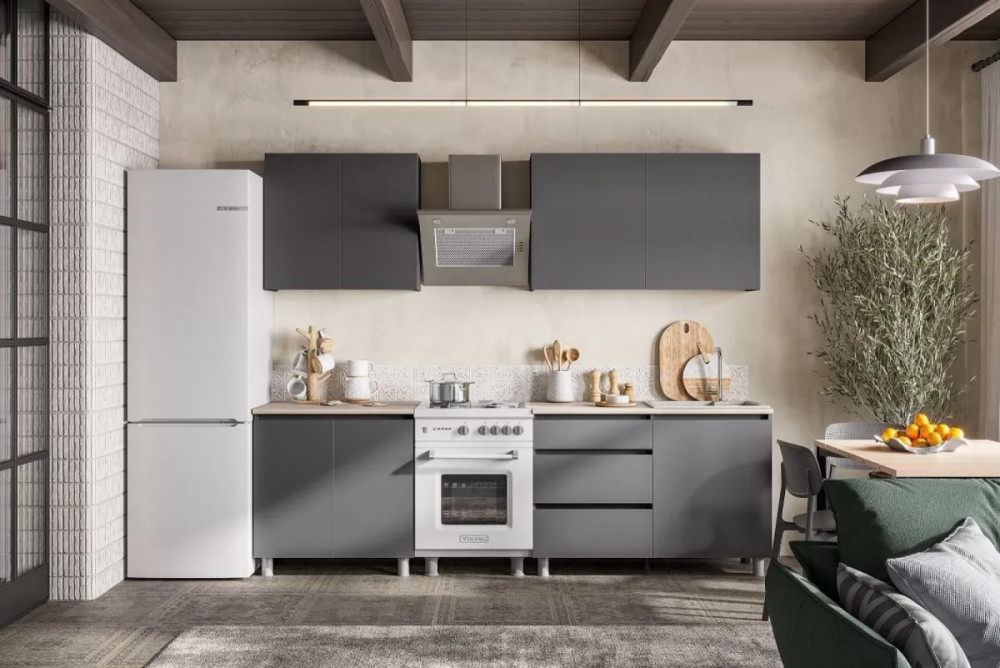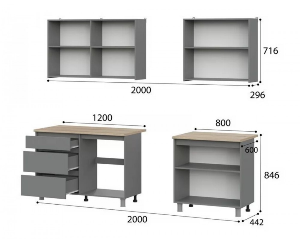 Вес (кг)127.4Ширина (мм)2000Глубина (мм)600Высота (мм)2140Материал изготовленияЛДСПЦвет корпус/фасад: Графит серыйСтолешница Дуб Сонома 26 ммФасады шкафов и столов не имеют ручек и скосов - это тренд на рынке кухрнных гарнитуров.Корпус/Фасад: ЛДСП 16 ммКухня имеет цоколя, впереди устанавливаются декоративные опоры.Петли - без доводчиков.Направляющие ящиков - роликовые.Все модули комплектуются столешницей (под врезную мойку)