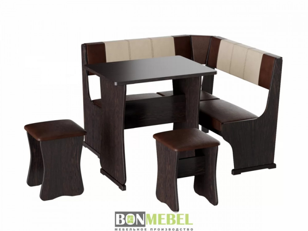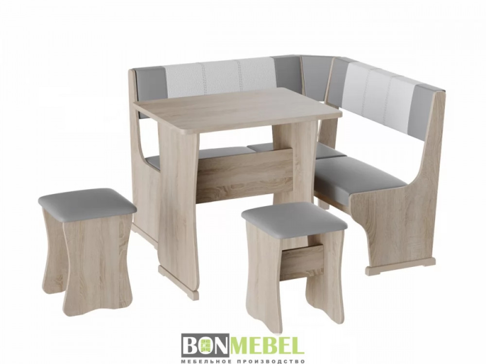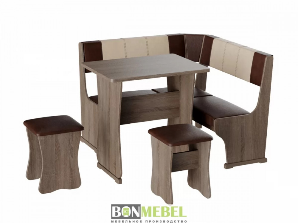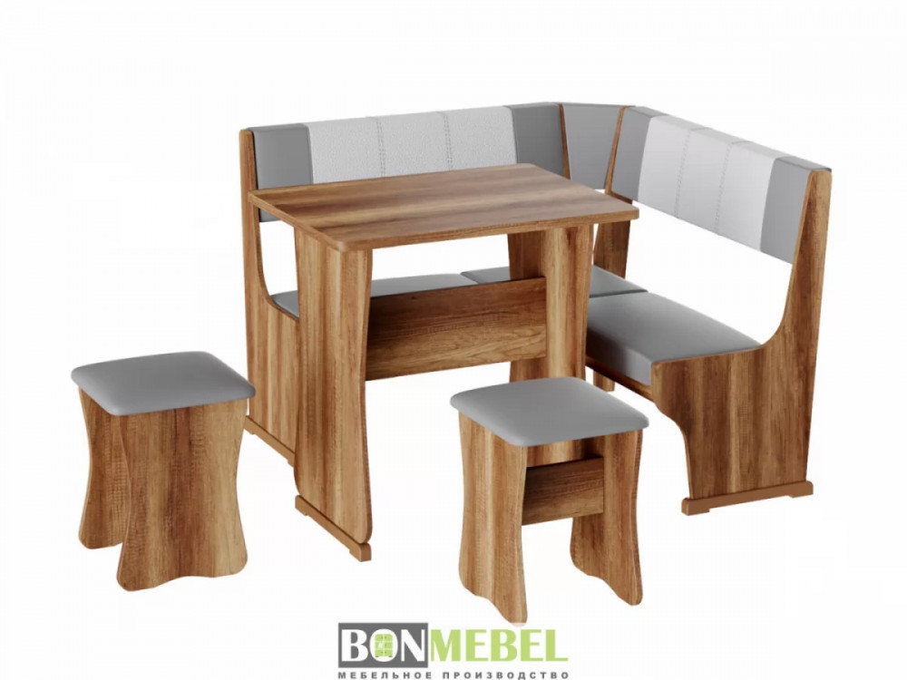 Небольшой оригинальный уголок для кухни. Такая модель выглядит изящно и современно, она придется по вкусу тем, кто любит уют и комфорт. Сборка скамьи универсальная, вы определить угол как с правой, так и с левой стороны. Обивка на табуретах и скамье выполнена из искусственной кожи с наполнителем из поролона. Каркас изделий изготовлен из ЛДСП, на ножках установлены пластиковые накладки. Конструкция не оснащена ящиком для хранения.