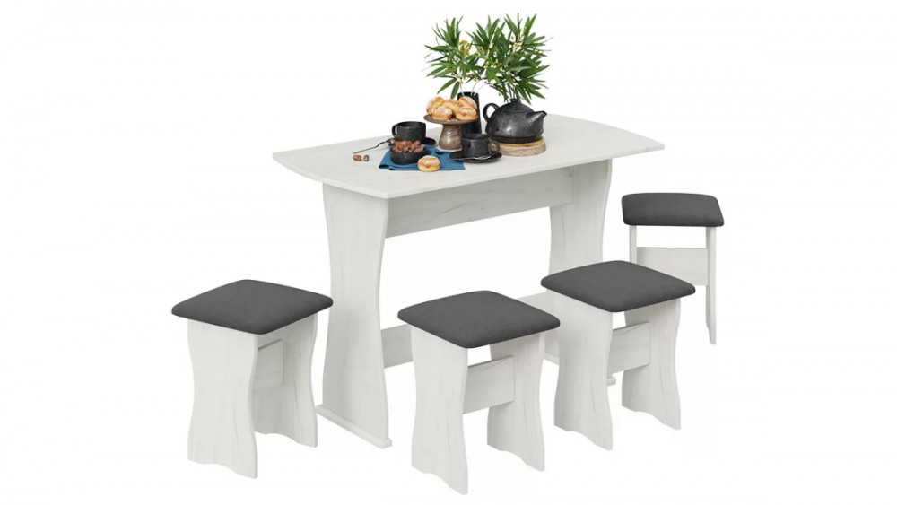 Назначение: Мебель для работы и приема пищи Гарантийный срок: 18 месяцев Комната использования: Кухня Стиль: Современный Габаритная длина: 1 100 Тип: Обеденная группа Расположение: Напольный Материал каркаса: ЛДСП Размеры стола: 1100х600х760 Дополнительная информация: Комплектация : стол + 4 табурета, материал мягкого сидения - кожзам. Производство: Россия Габаритная ширина: 600 Габаритная высота: 760 Размеры табуретов: 340х340х430 Срок службы: 5 лет Оттенок: Платиновый, Серый Цвет: Дуб крафт белый/Велюр серый Обивочный материал: Велюр Цвет каркаса: Дуб крафт белый Оттенок каркаса: Платиновый Оттенок обивки: Серый Цвет обивки: Велюр серый Материал столешницы: ЛДСП Заглушина для ящика кровати в комплекте: Нет Наличие механизма раскладки: Нет Наличие спального места: Нет