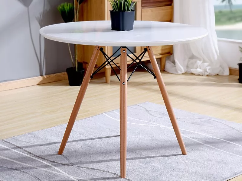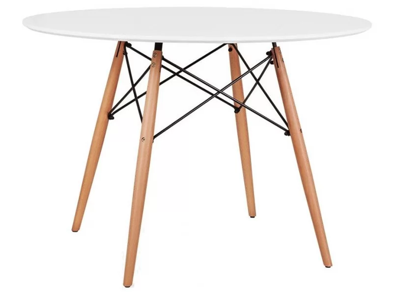 Стол в стилей Eames — настоящий хит скандинавского дизайна, уже несколько лет не теряющий своей популярности. Столешница выполнена из экологичного матового МДФ, по износостойкости и долговечности превосходящего натуральную древесину. Белый цвет столешницы привносит в пространство ощущение чистоты и свежести. Ножки из цельного массива светлого бука и геометрические металлические подпорки делают стол невероятно устойчивым и прочным. Благодаря натурального расцветке и округлой форме стол в стиле Eames DSW идеально впишется как в жилое помещение, так и в общественную зону кафе или ресторана, особенно хорошо подчеркнув интерьер в стиле минимализм или хай-тек.