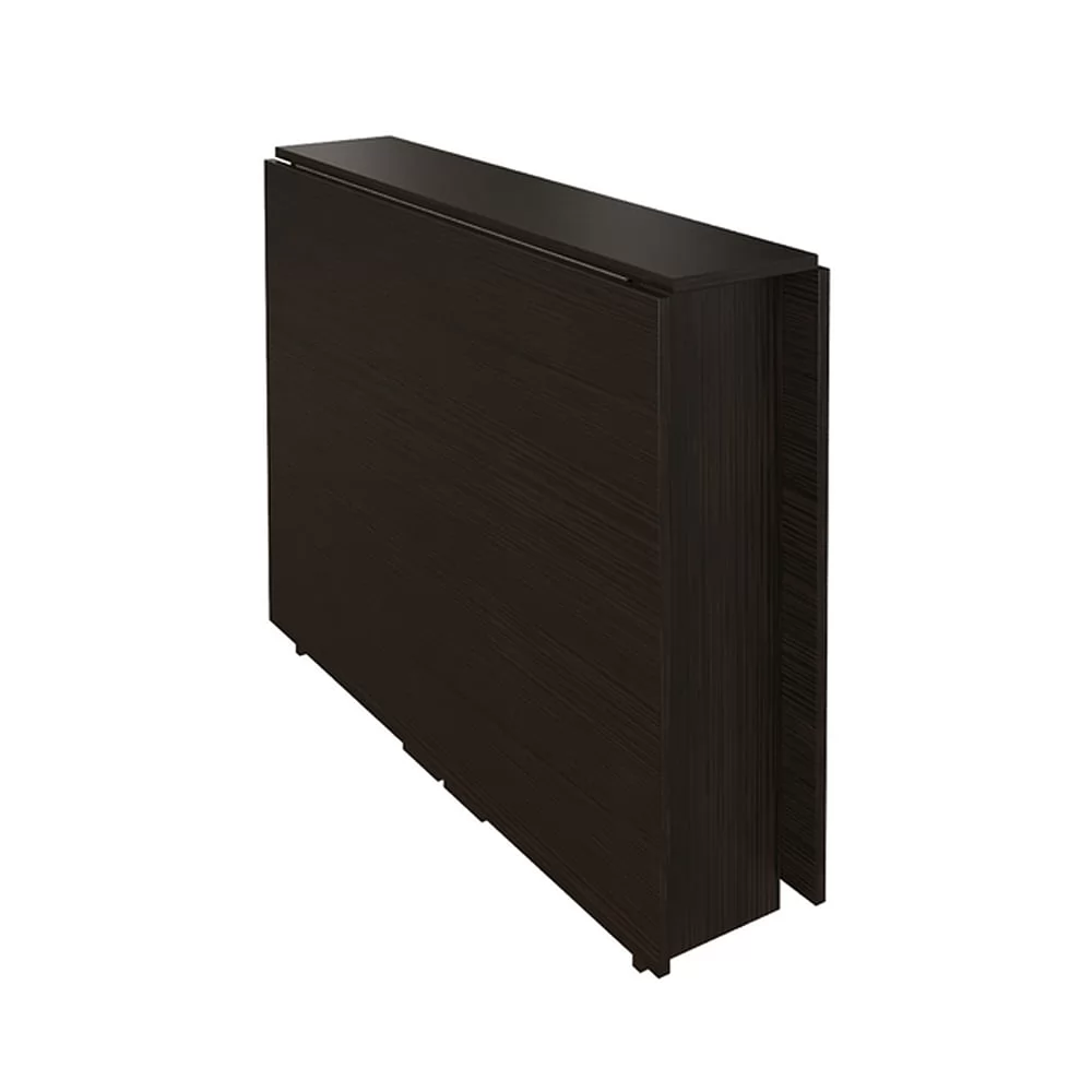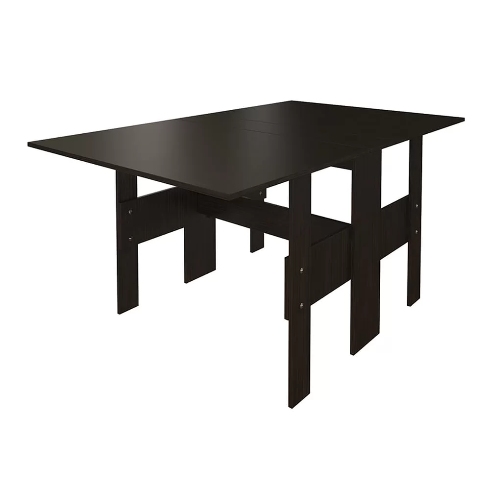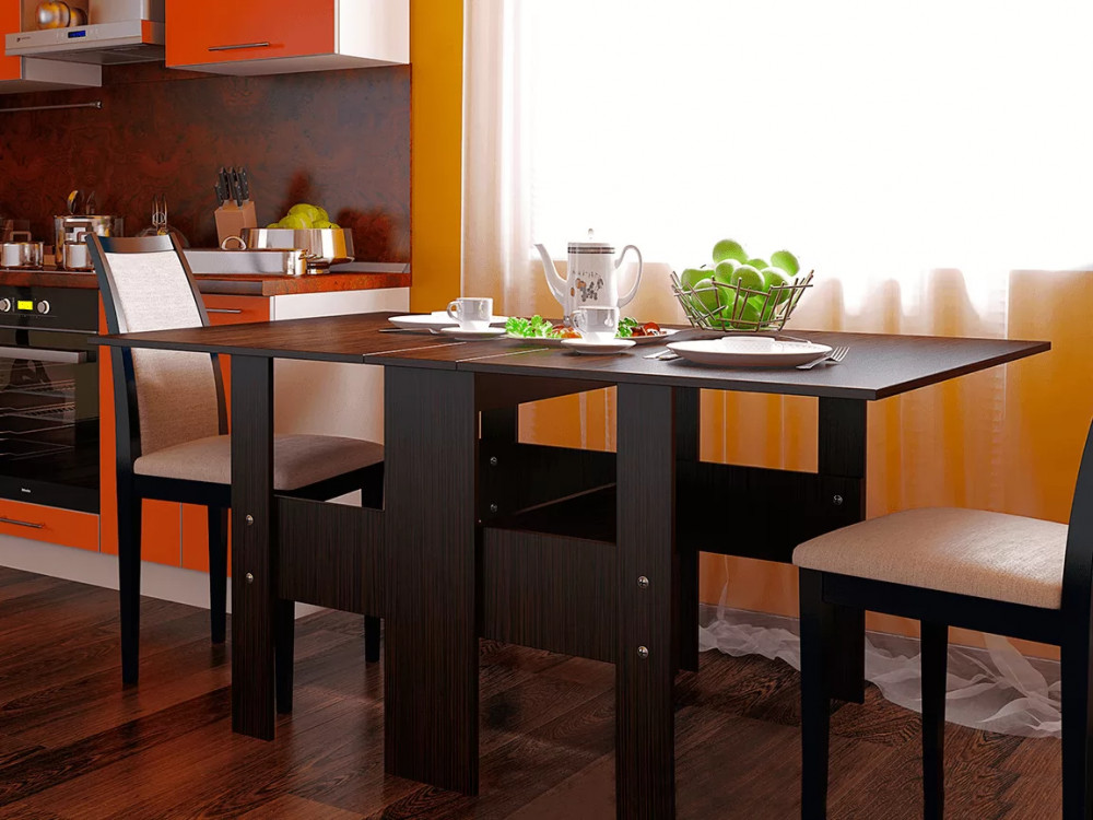 - при необходимости столешница компактной модели раскладывается на две стороны и превращается в полноценный обеденный стол, за которым поместится немало гостей, - изделие выполнено из высококачественной ЛДСП темного цвета венге и прекрасно впишется в интерьер любого стиля.