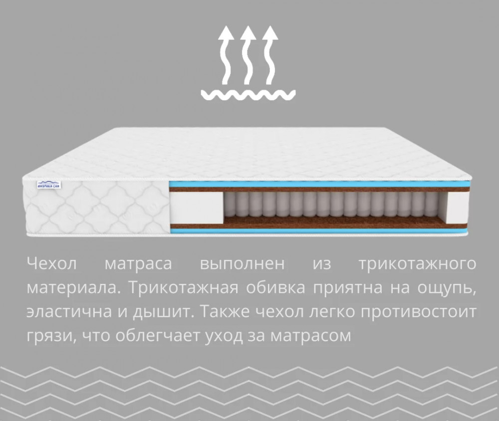 • Чехол в трикотажной обивке: Она легко снимается и стирается, что облегчает уход за матрасом.