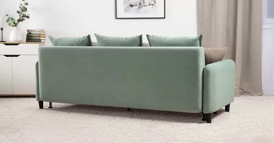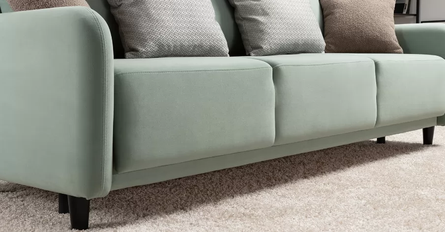 Объемные подушки обеспечивают комфортный отдых. В комплекте 5 двусторонних приспинных подушек и 2 декоративные подушки-думки в ткани букле. Надежный механизм трансформации и ровное спальное место обеспечивают полноценный сон.