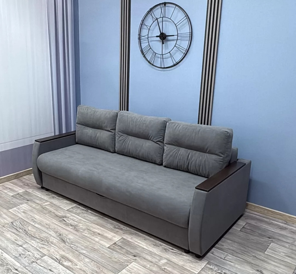Прекрасное сочетание элегантности и изящества. Подлокотники с декоративными накладками делают его безупречным для любого интерьерного решения. Механизм трансформации «Пантограф» (тик-так) позволяет без особых усилий формировать ровное спальное место. Так же имеется вместительный короб для постельных принадлежностей.