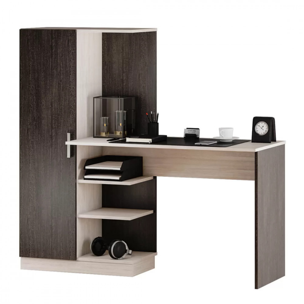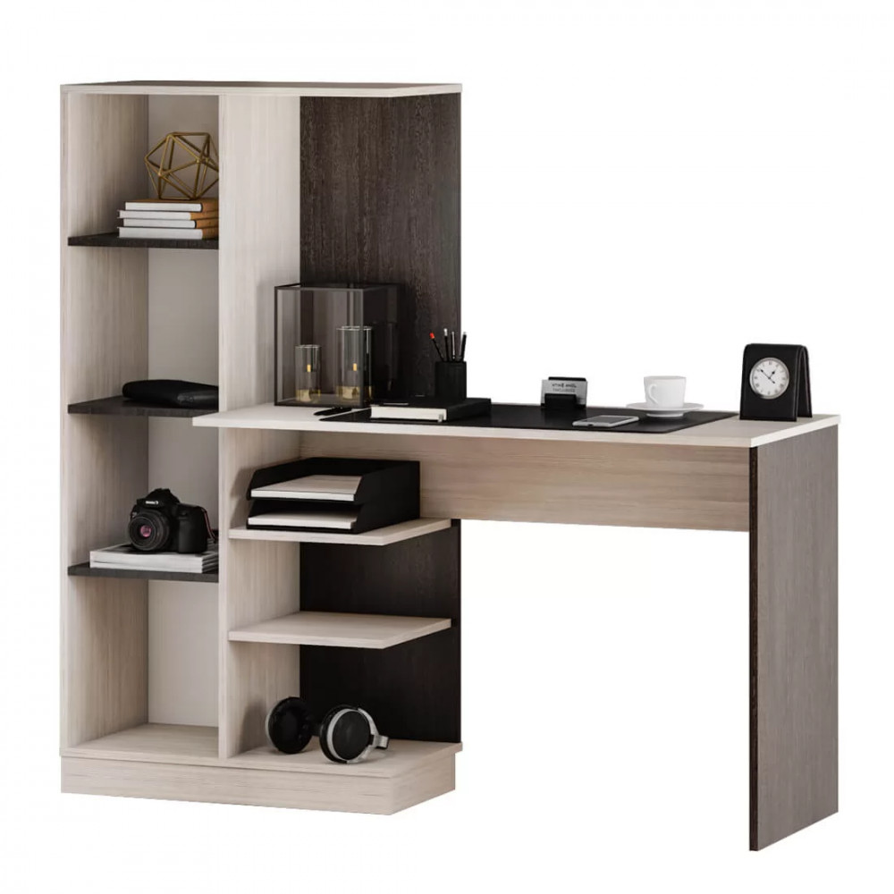 -модель сделана из ЛДСП двух цветов – белого и сонома, -благодаря такому цветовому решению, изделие будет выигрышно смотреться в любом интерьере, -конструкция модели представляет собой вместительную столешницу, зону с открытыми полками, -небольшой пенал с распашной дверцей, в котором можно хранить необходимые для занятий вещи.