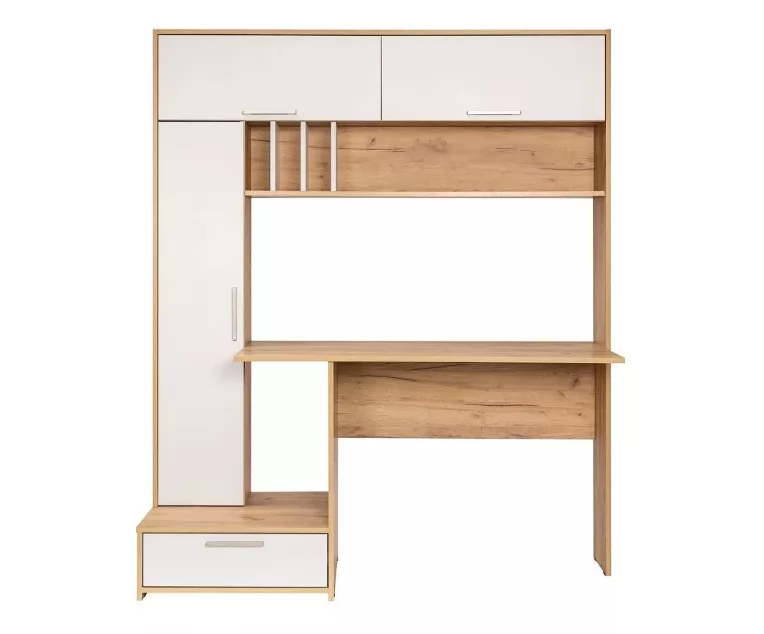 Рабочий стол отлично подойдет для комнаты школьника или организации домашнего офиса. Современный дизайн конструкции прекрасно впишется в интерьер любой комнаты. На широкой столешнице можно свободно разместить ноутбук, настольную лампу и письменные принадлежности. Богатая система хранения позволит содержать рабочее место в чистоте и порядке. Конструкция состоит из закрытого вертикального блока с тремя полками, выдвижного ящика и двух объемных ниш с откидными дверцами. Дополнительно в систему включена большая открытая полка с отсеками для документов.