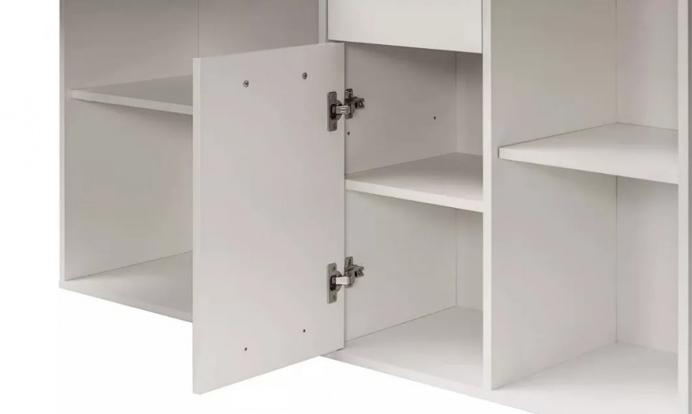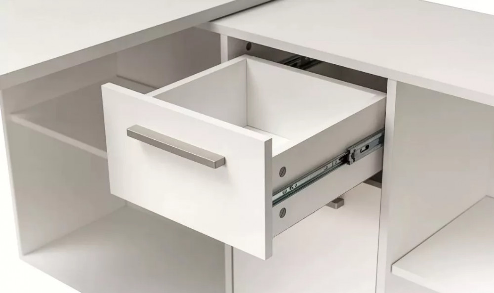 Универсальный рабочий стол, который можно собрать как в угловой, так и в прямой ориентации. Широкая столешница позволит свободно разместить ноутбук, настольную лампу и письменные принадлежности. Система хранения стола состоит из тумбы с четырьмя открытыми нишами разного размера, одного закрытого шкафчика с полкой внутри и выдвижного ящика.