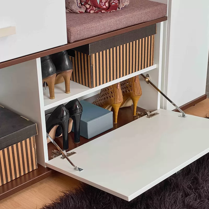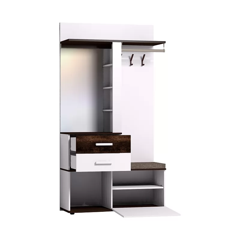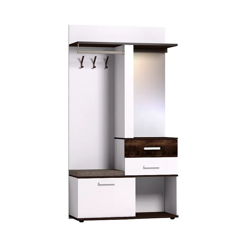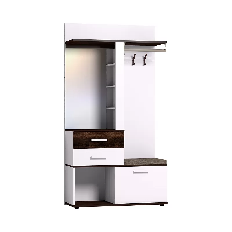 Многофункциональный шкаф Норвуд 70 - находка для маленькой прихожей. В небольшом по габаритам модуле (шириной 1120 мм и глубиной 400 мм) сочетается всё необходимое: крючки, стационарная штанга, открытые полки, выдвижные ящики, отделение за откидным фасадом, открытая ниша, зеркало с подсветкой. Встроенная светодиодная подсветка включается при помощи аккуратного кнопочного выключателя. Откидной фасад дополнительно фиксируется при закрывании магнитной защелкой. Горизонтальные детали толщиной 22 мм в декоре Орех Шоколадный и фасад верхнего ящика из дерева с брашировкой контрастируют с белым декором модуля. В комплектацию входит мягкое сидение, которое позволит обуваться с комфортом. Регулируемые опоры помогут компенсировать неровный пол в прихожей. Собрать Шкаф МЦН можно как на правую, так и на левую сторону.