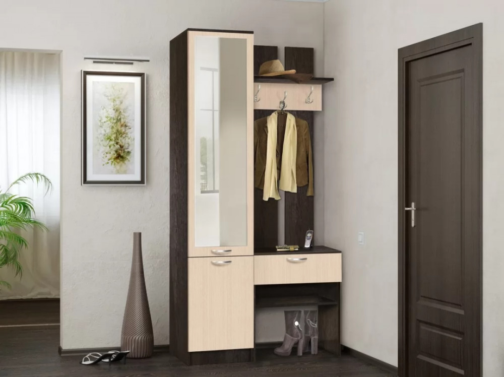 Прихожая имеет простой дизайн и прямые формы. Она состоит из вешалки с тумбой и пенала. Открытая вешалка оборудована полкой для головных уборов, тремя 3-х рожковыми крючками для одежды, ниже выдвижной ящик на роликовых направляющих, под ним открытая ниша с полкой. За распашными дверьми пенала три полки. Тип сборки и направление открытия дверей определеяется при сборке.