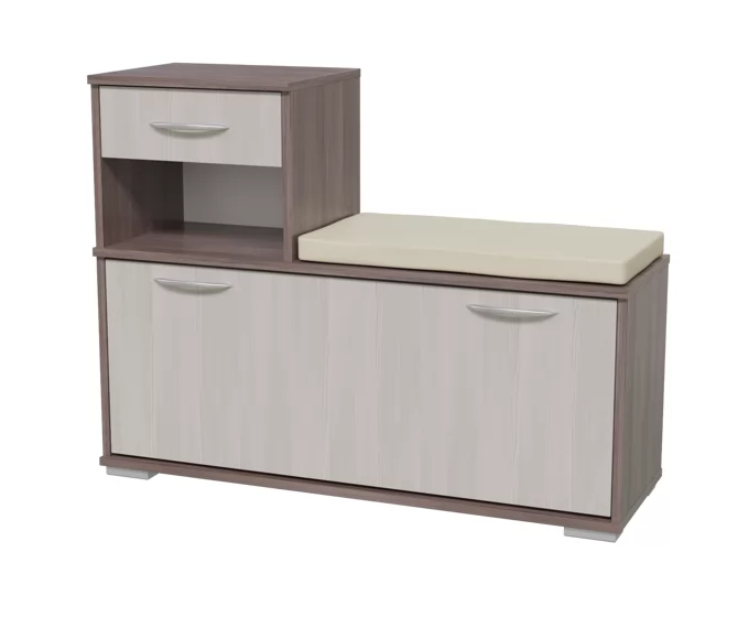 Прихожая "Лира" - компактная мебель для небольшой квартиры. Вешалка оборудована шестью крючками для одежды, антресольной полкой для головных уборов и большим зеркалом. Тумба оборудована выдвижным ящиком, обувницей, и мягким элементом для сидения.