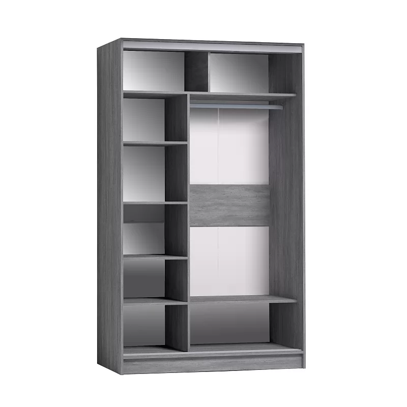 Продуманное внутреннее наполнение шкафа состоит из стеллажа для белья и стационарной штанги длиной 725 мм. На ней поместится как минимум 10 плечиков с верхней одеждой. В изготовлении шкафов-купе STRIKE использована прочная стальная система треков «Найди» цвета Металлик. Двери шкафов дополнены ручками из массива и шлегелем, который смягчает удары дверей при закрывании, а также защищают вещи от попадания пыли. Благодаря скрытым полкодержателям полки жестко крепятся на необходимой высоте.