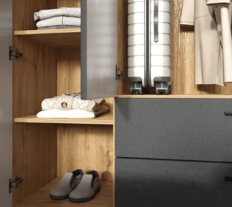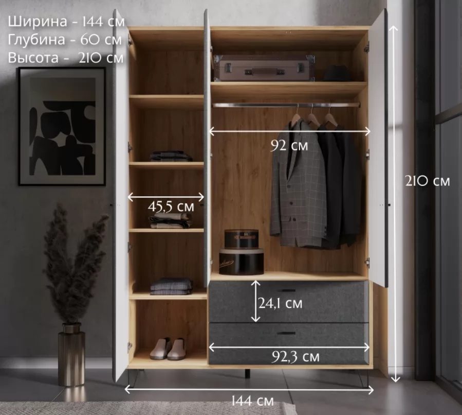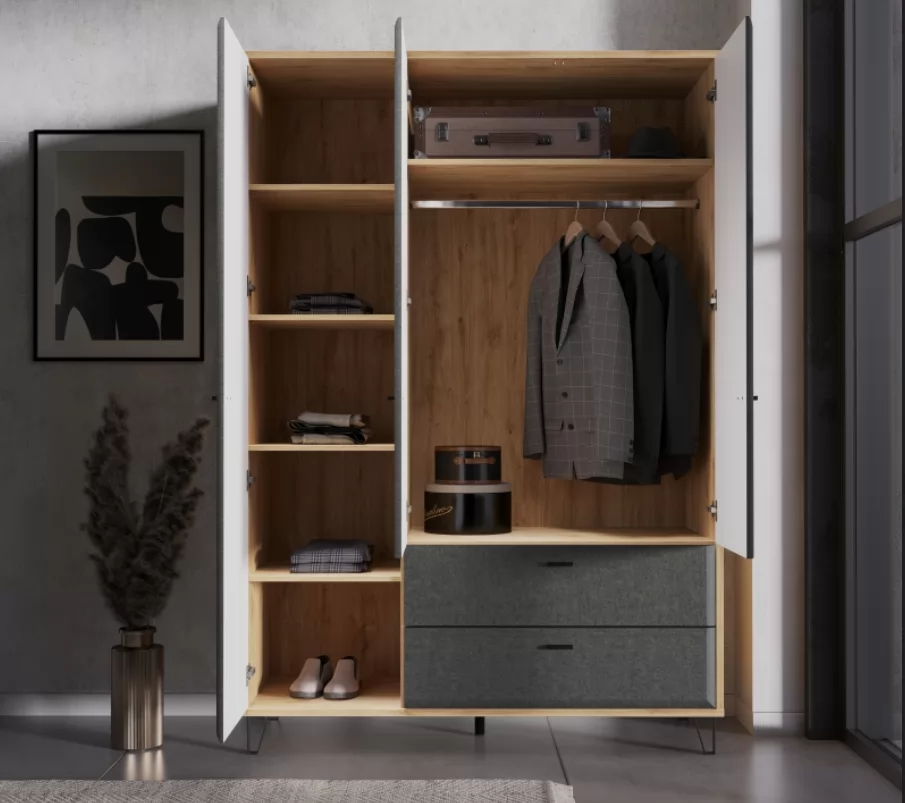 Внутреннее пространство шкафа организовано таким образом, чтобы обеспечить максимальное удобство при хранении вещей. Просторные полки предоставляют достаточно места для аккуратного хранения одежды, постельного белья и аксессуаров. В нижней части шкафа расположены несколько вместительных ящиков, идеально подходящих для хранения мелких предметов, белья или других аксессуаров.