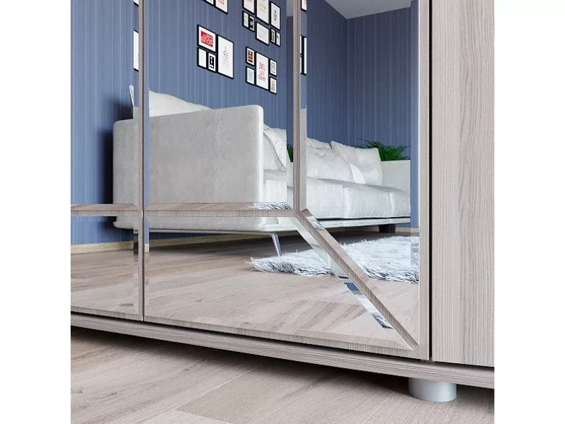Шкаф с распашными дверями, с двух сторон отделение с тремя антресольными полками и горизонтальными штангами под ними. В центре шкаф украшают зеркала из 12-ти сегментов, внутри расположены антресольная полка, горизонтальная штанга и нижняя полка.