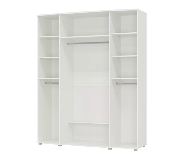 В этом шкафу три отдела со штангами: стандартное и два отдела метровой высоты — для хранения блузок и рубашек, брюк и юбок, которые отлично разместятся в этом большом шкафу. Четыре распашных двери обеспечат легкий доступ к вещам.