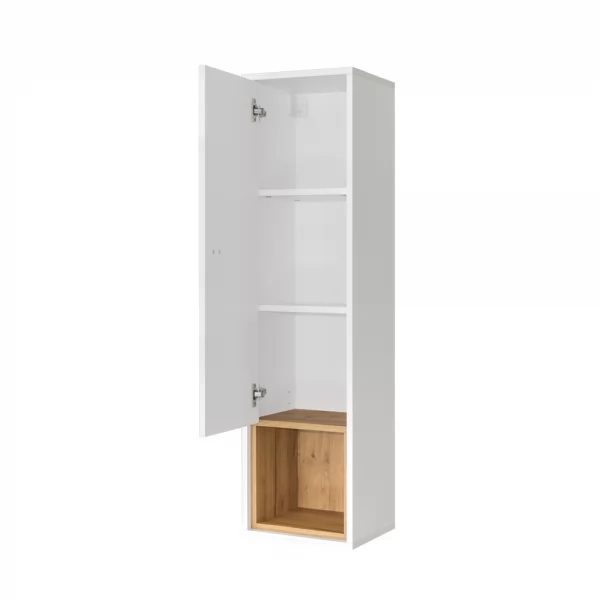 Навесной шкаф из модульной серии "Бэль" состоит из блока полок за распашной дверцей и открытой ниши. Универсальная модель может быть размещена на стене в двух вариантах - открытая ниша может быть сверху или снизу.