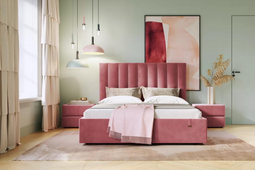 Кровать «Ingrid» подойдет для современных интерьеров спален, впишется в стиль ретро и скандинавский минимализм. Обивка будет отлично сочетаться с любыми цветовыми оттенками отделки и мебели. Кровати выполнены в нейтральных и ярких тканях велюр, что позволяет подобрать подходящий вариант почти под любой интерьер. Изголовье имеет прямоугольную форму, повторяя очертания кровати. Дизайн модели отличается высоким изголовьем с вертикальными строчками и углублениями.
