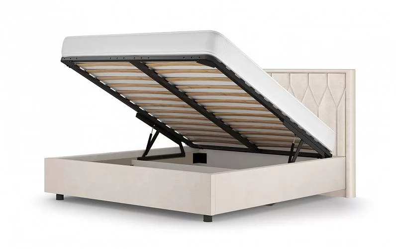 Каркас кровати выполнен из ЛДСП, особую прочность кровати придает металлический держатель основания из стали 2 мм. Подъемное основание оснащено надежным газлифтом.