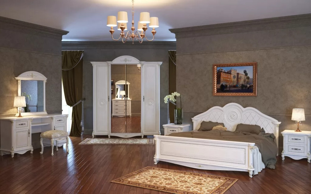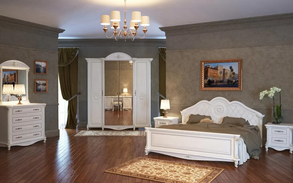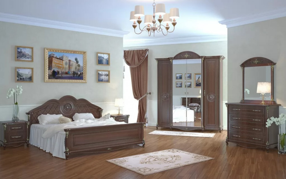 Спальный гарнитур выполнен в классическом стиле. Это изысканный дизайн с резными элементами и декором. Овальное изголовье, рисунки на фасадах, придают мебели для спальни эффект дороговизны и благородства. Такая спальня способна восхищать и удивлять. Вы можете приобрести как весь комплект, так и по отдельности. Изделия отвечают всем стандартам и имеют длительный срок эксплуатации.