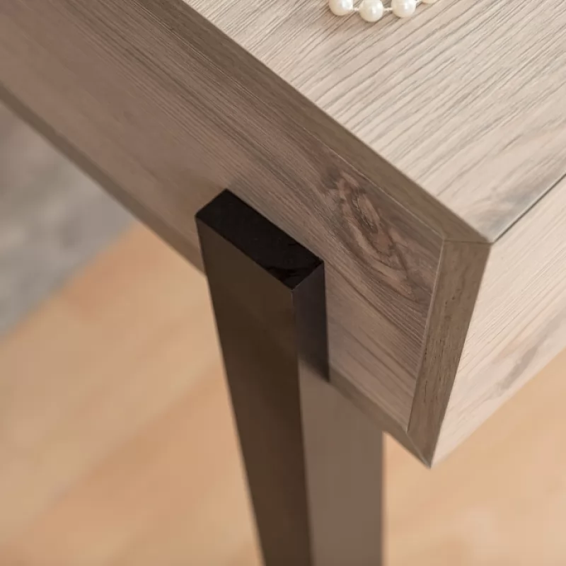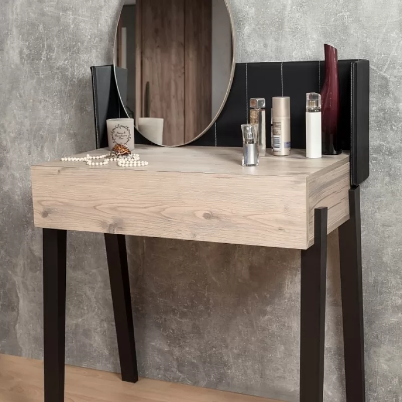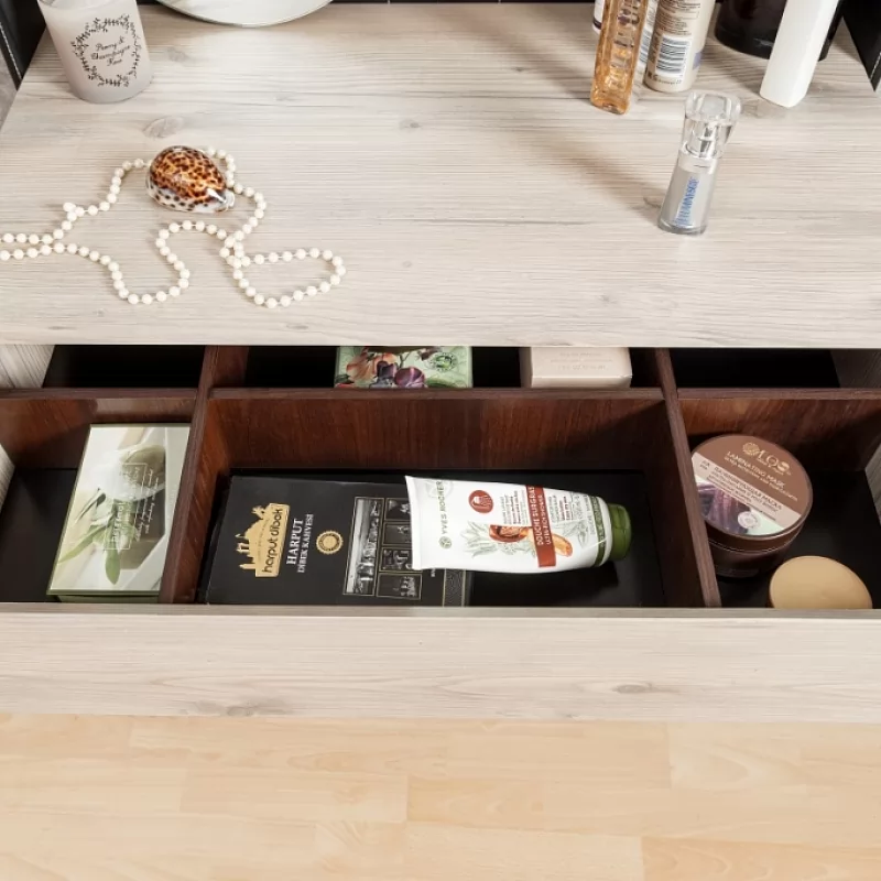 Туалетный столик просто необходим красивой женщине, которая привыкла за собой ухаживать не бегом, в ванной или прихожей, а обстоятельно. Стильный и функциональный он не займет много места в маленькой спальне. Разместите его в спальне у окна, и лучший естественный свет вам обеспечен. Ящики оснащены шариковыми направляющими, что обеспечивает их движению плавных ход и минимальный люфт.